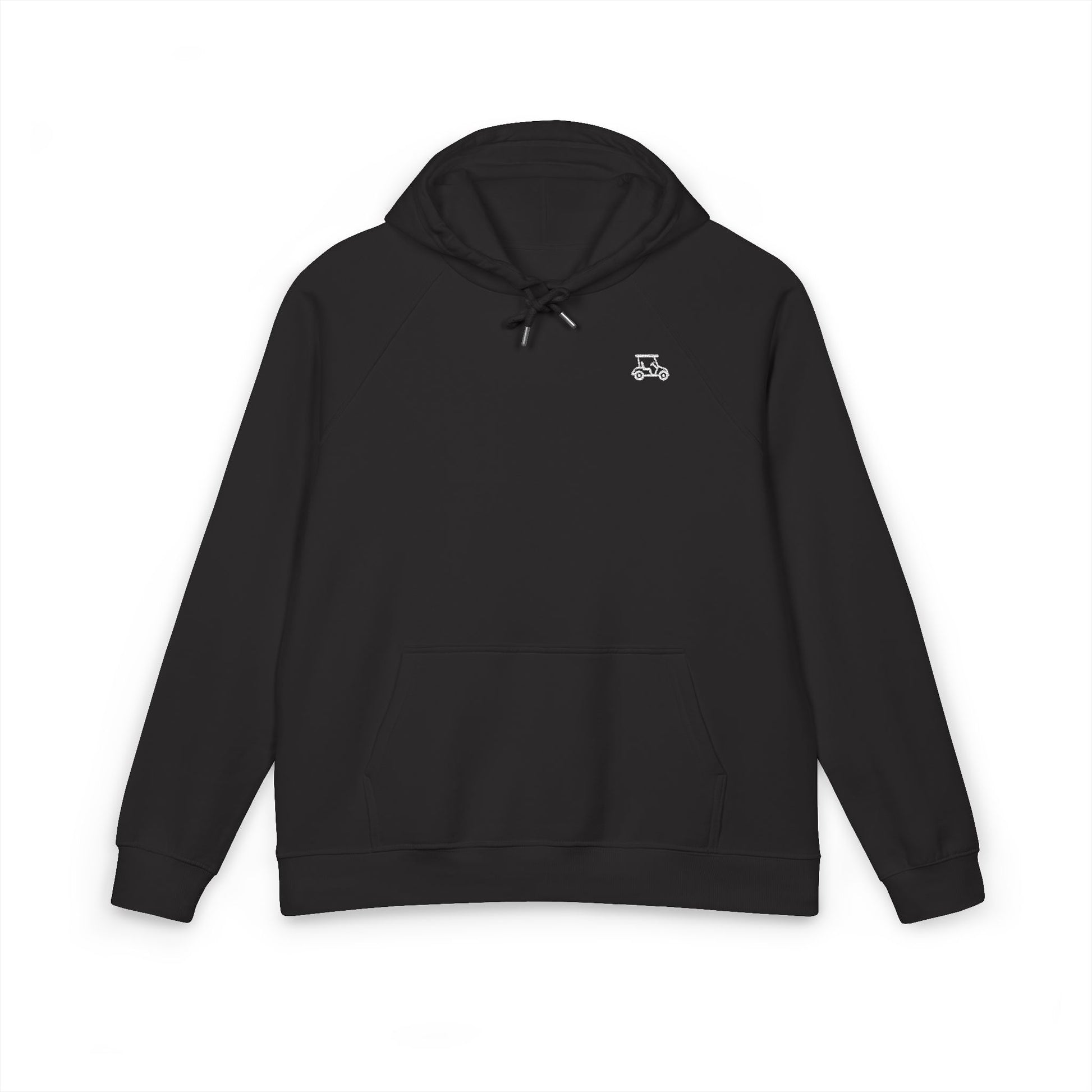 Your new favorite hoodie, with the trademark Low Score Golf cart on the sleeve. White Logo.